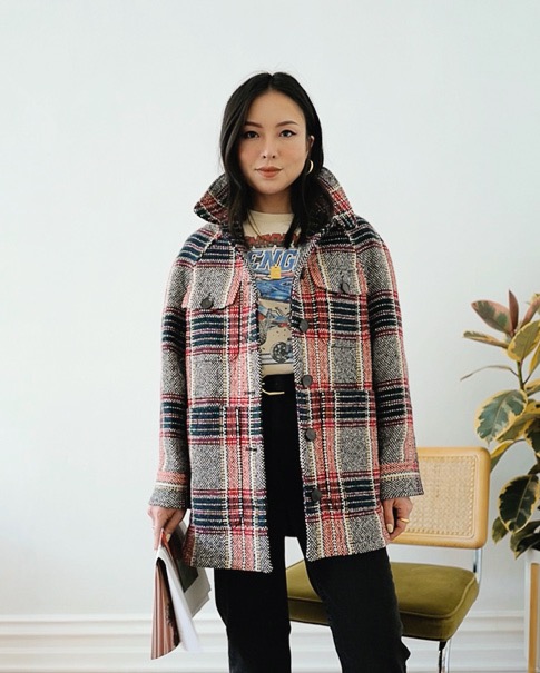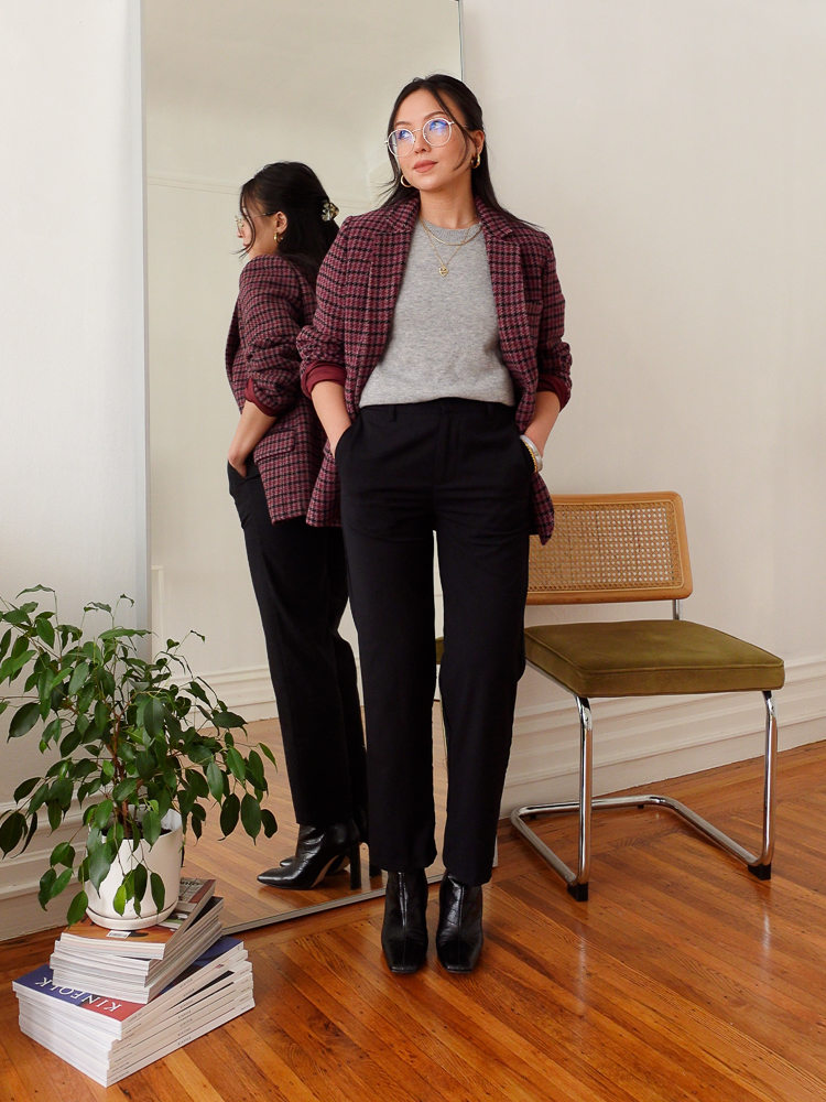 Outfit details: Isabel Marant Etoile Charly Jacket (previous season; color “raspberry”), And Other Stories Boxy Alpaca T-Shirt, Urban Outfitters Pants (old style, similar here), Miista Marcelle Croc-Embossed Boots
