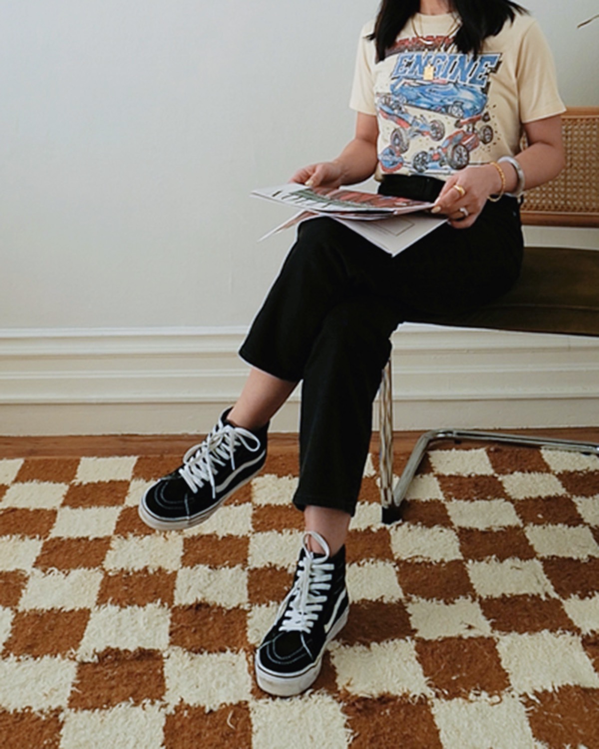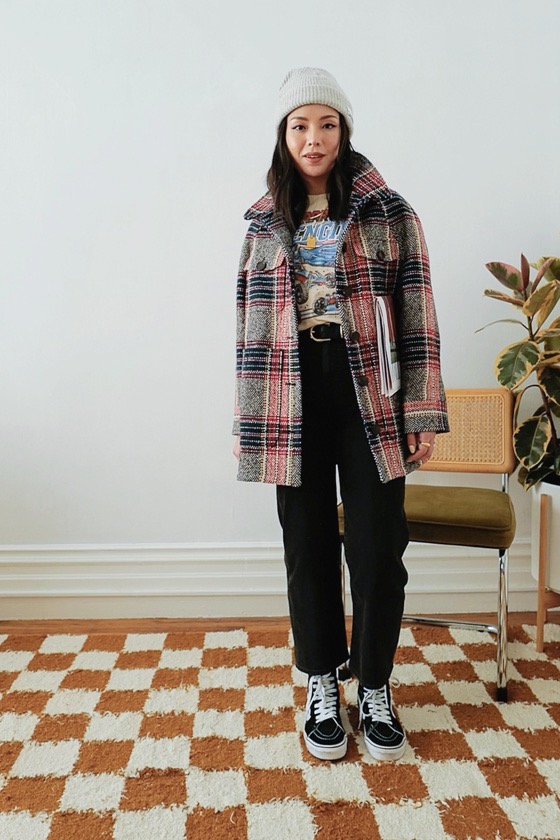 Outfit details: Clare Vivier Graphic Cotton Sweatshirt, Gap Tank (sold out, similar from BR), Boyish The Mikey High Rise Wide Leg Jeans (different wash), Everlane Beanie (sold out, Madewell Version), Vans Checkerboard Slip-On Sneakers