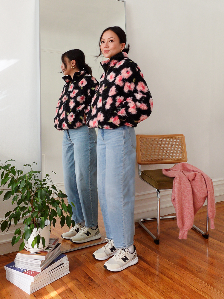 Outfit details: Sandy Liang x Target Fleece, Madewell Petite Balloon Jeans, New Balance Fresh Foam X70 Sneakers